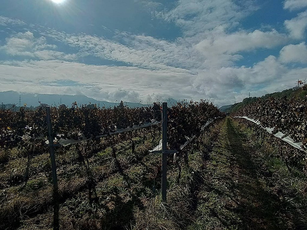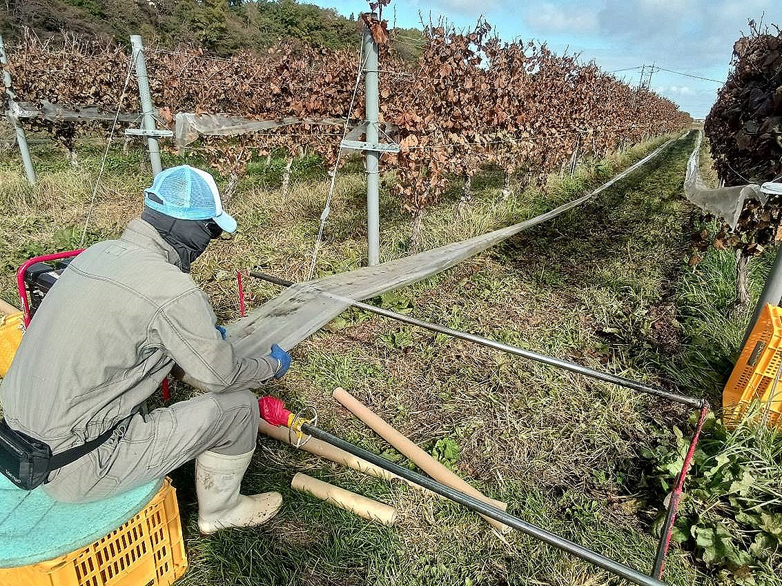 ぶどうを守っていたレインプロテクション(雨よけ)とバードネット(防鳥網)の撤収を開始しています。