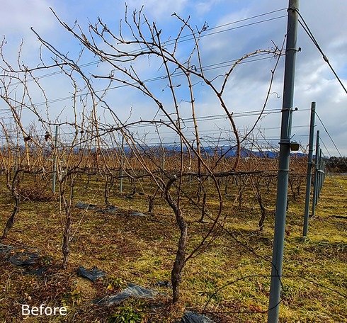 写真は、アルプスファーム奈良井川左岸に位置する『芦ノ田圃場』のシャルドネの剪定前、剪定後です。